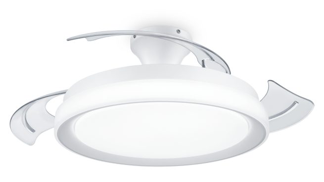 Ξεχάστε τις κινούμενες σκιές στην οροφή: αυτός ο ανεμιστήρας έχει διάφανα πτερύγια που αναδιπλώνονται μέσα στο φωτιστικό και δεν φαίνονται όταν δεν χρησιμοποιείται.